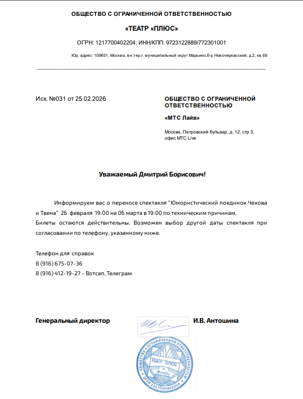 Уважаемый клиент! Актуальная информация. Спешим сообщить, что по информации, полученной от организатора, спектакль «#ПСИХО», запланированный на 23 февраля 2026 года в 19:10 в Центральном Доме Актёра, отменён. Организатор предлагает выбрать любое мероприятия из репертуара ООО «Театр +». По вопросам переноса спектакля обращайтесь, пожалуйста, к главному администратору театра по номеру телефона: 8 (916) 123-37-15 (Галина) и 8 (906) 700-62-83 (Сергей). Если вам не удобно посетить любое мероприятие организатора в новую дату, вы можете вернуть билет по кнопке в личном кабинете во вкладке «Заказы» (до 28 февраля 2026 года включительно). Деньги за электронные билеты вернутся автоматически в полном объёме на карту, с которой была произведена оплата. Если вы купили билет в кассе Ticketland.ru за наличный расчет, то обратитесь, пожалуйста, на почту: vozvrat@ticketland.ru. С уважением, команда поддержки Ticketland.