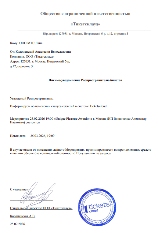 Уважаемый клиент! Спешим сообщить, что по информации, полученной от организатора, концерт «Unique Pleasure Awards», запланированный на 25 февраля 2026 года в 19:00 в Москва-Сити, Башня Федерации, перенесён на 25 марта 2026 года в 19:00. Ранее приобретенные билеты действительны, обменивать их не нужно. Если вы не хотите посетить мероприятие, вы можете вернуть билет по кнопке в личном кабинете во вкладке «Заказы». Деньги за электронные билеты вернутся автоматически в полном объёме на карту, с которой была произведена оплата. Если вы купили билет в кассе Ticketland.ru за наличный расчет, то обратитесь, пожалуйста, на почту: vozvrat@ticketland.ru. С уважением, команда поддержки Ticketland.