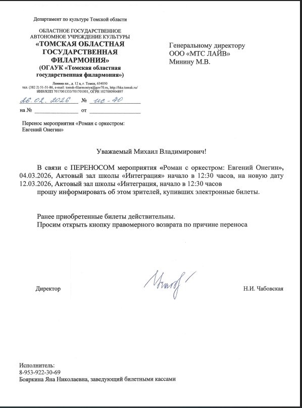 Уважаемый клиент! Спешим сообщить, что по информации, полученной от организатора, концерт «Роман с оркестром: Евгений Онегин», запланированный на 2026-03-04 в 12:30, перенесён на 2026-03-12 в 12:30 в Актовый зал школы «Интеграция». Ранее приобретенные билеты действительны на новую дату, обменивать их не нужно. Если вам не удобно посетить мероприятие в новую дату, вы можете вернуть билет по кнопке в личном кабинете во вкладке «Заказы». Деньги за электронные билеты вернутся автоматически в полном объёме на карту, с которой была произведена оплата. Если вы купили билет в кассе Ticketland.ru за наличный расчет, то обратитесь, пожалуйста, на почту: vozvrat@ticketland.ru. С уважением, команда поддержки Ticketland.