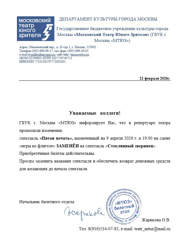 Уважаемый клиент! Спешим сообщить, что по информации, полученной от организатора, спектакль «Пятая печать», запланированный на 9 апреля 2026 года в 19:00 в МТЮЗе, заменен на спектакль «Стеклянный зверинец». Ранее приобретенные билеты действительны, обменивать их не нужно. Если вы не хотите посетить мероприятие, вы можете вернуть билет по кнопке в личном кабинете во вкладке «Заказы». Деньги за электронные билеты вернутся автоматически в полном объёме на карту, с которой была произведена оплата. Если вы купили билет в кассе Ticketland.ru за наличный расчет, то обратитесь, пожалуйста, на почту: vozvrat@ticketland.ru. С уважением, команда поддержки Ticketland.